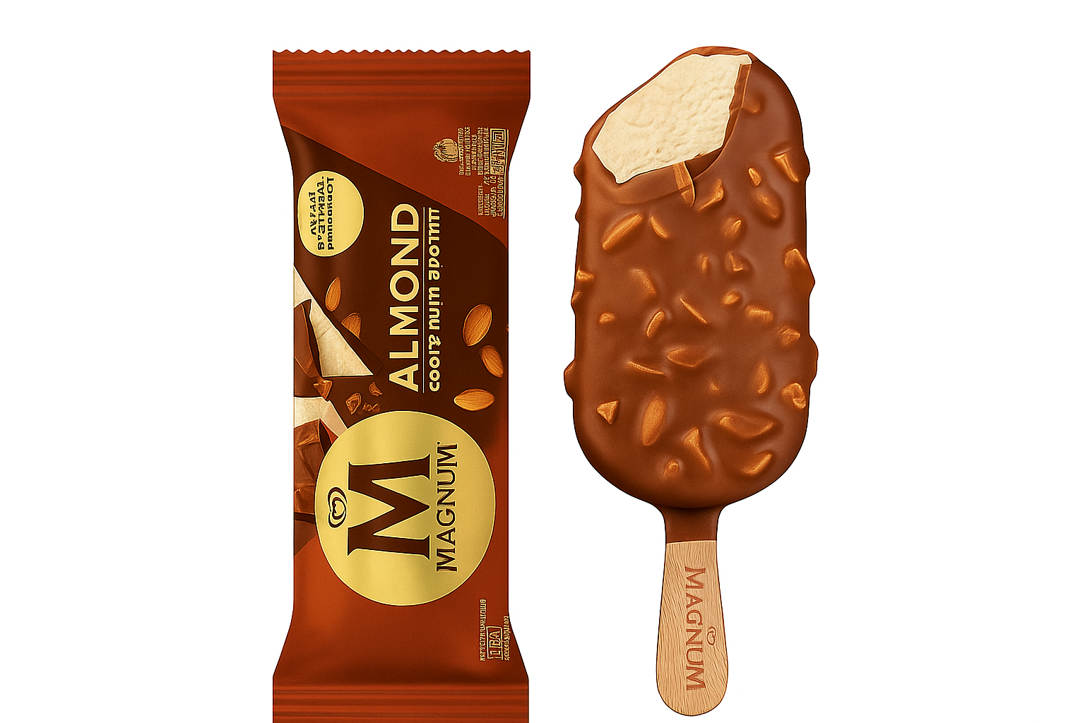 Magnum Almond combines smooth vanilla ice cream with a thick layer of rich chocolate and crunchy almond pieces