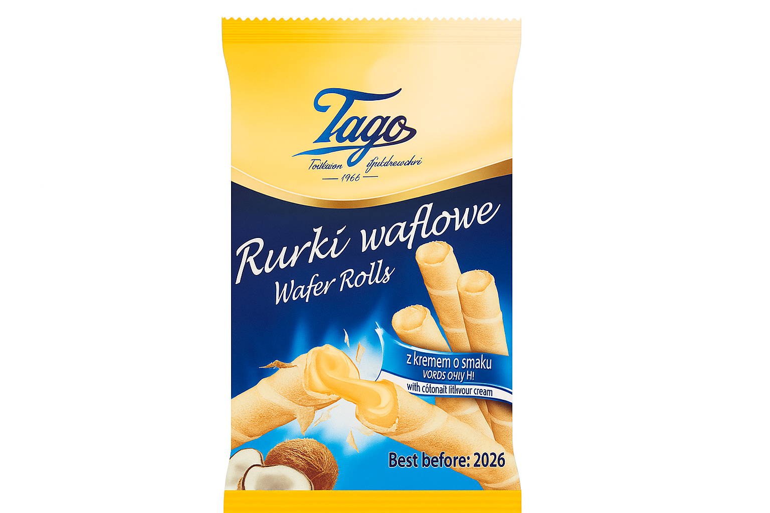 TAGO COCONUT WAFER ROLLS are crispy wafer rolls filled with luscious coconut cream delivering a perfect balance of crunch and smooth tropical flavor These light and crunchy treats pair wonderfully with coffee or tea offering a refreshing coconut center Suitable for vegetarians they are an ideal snack for any time of day